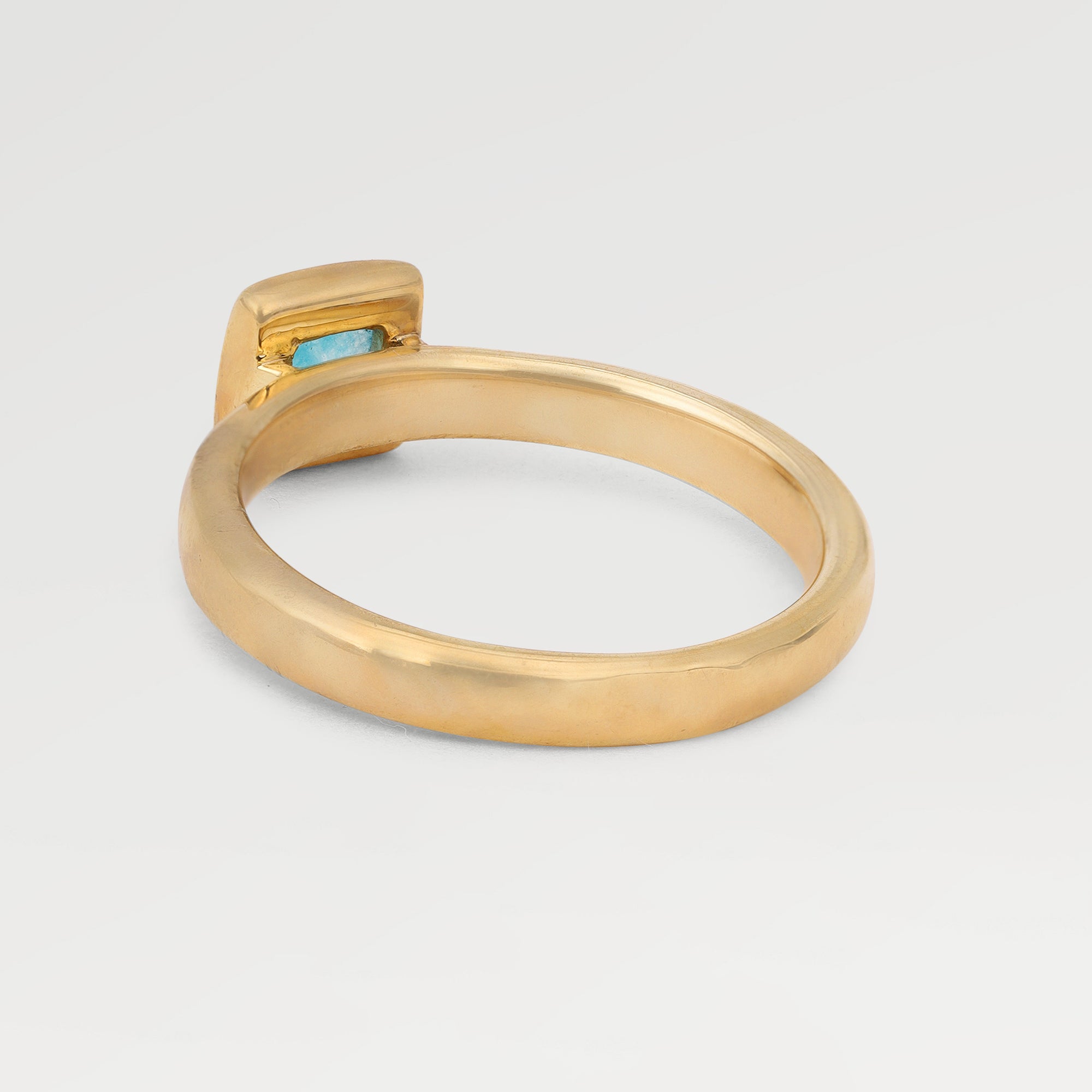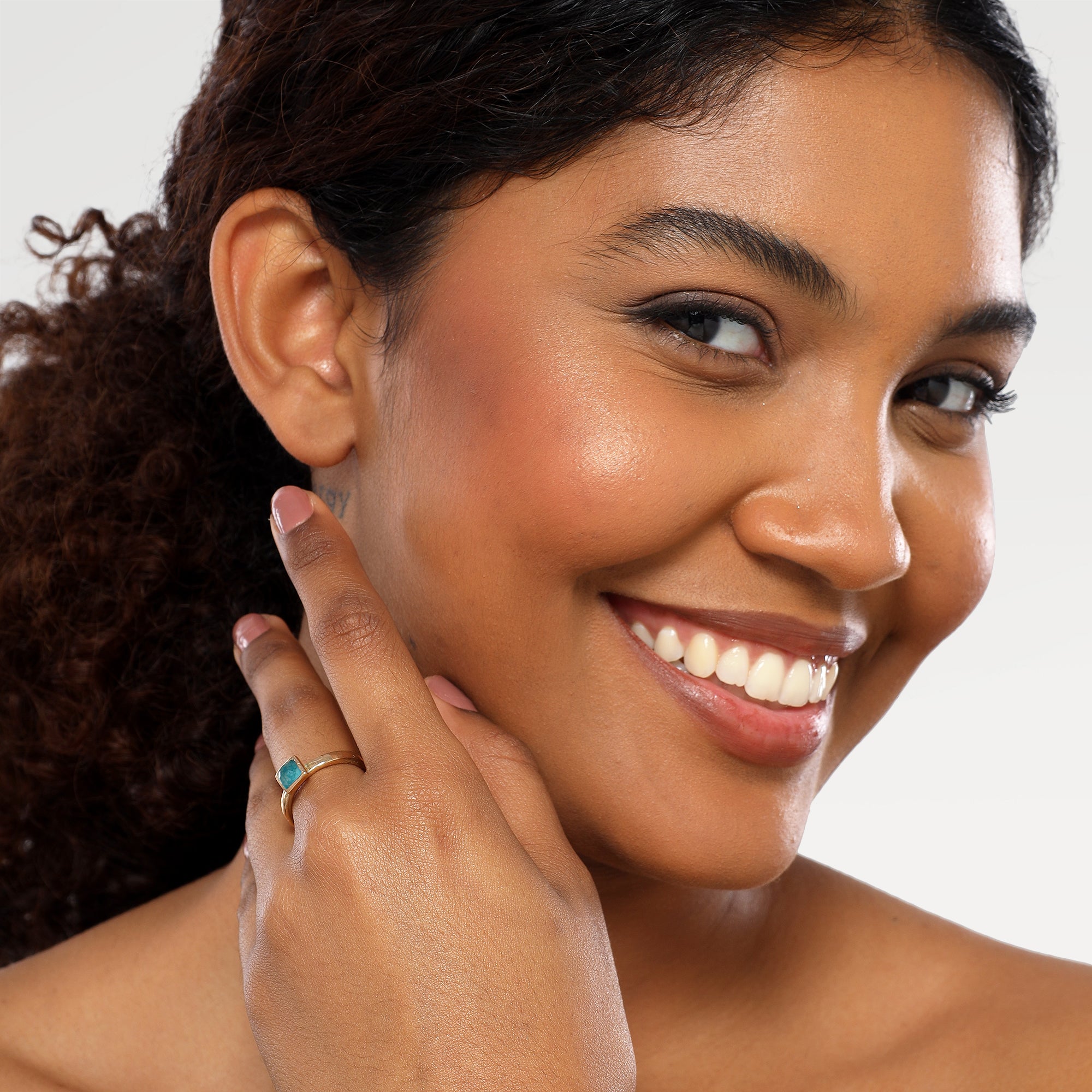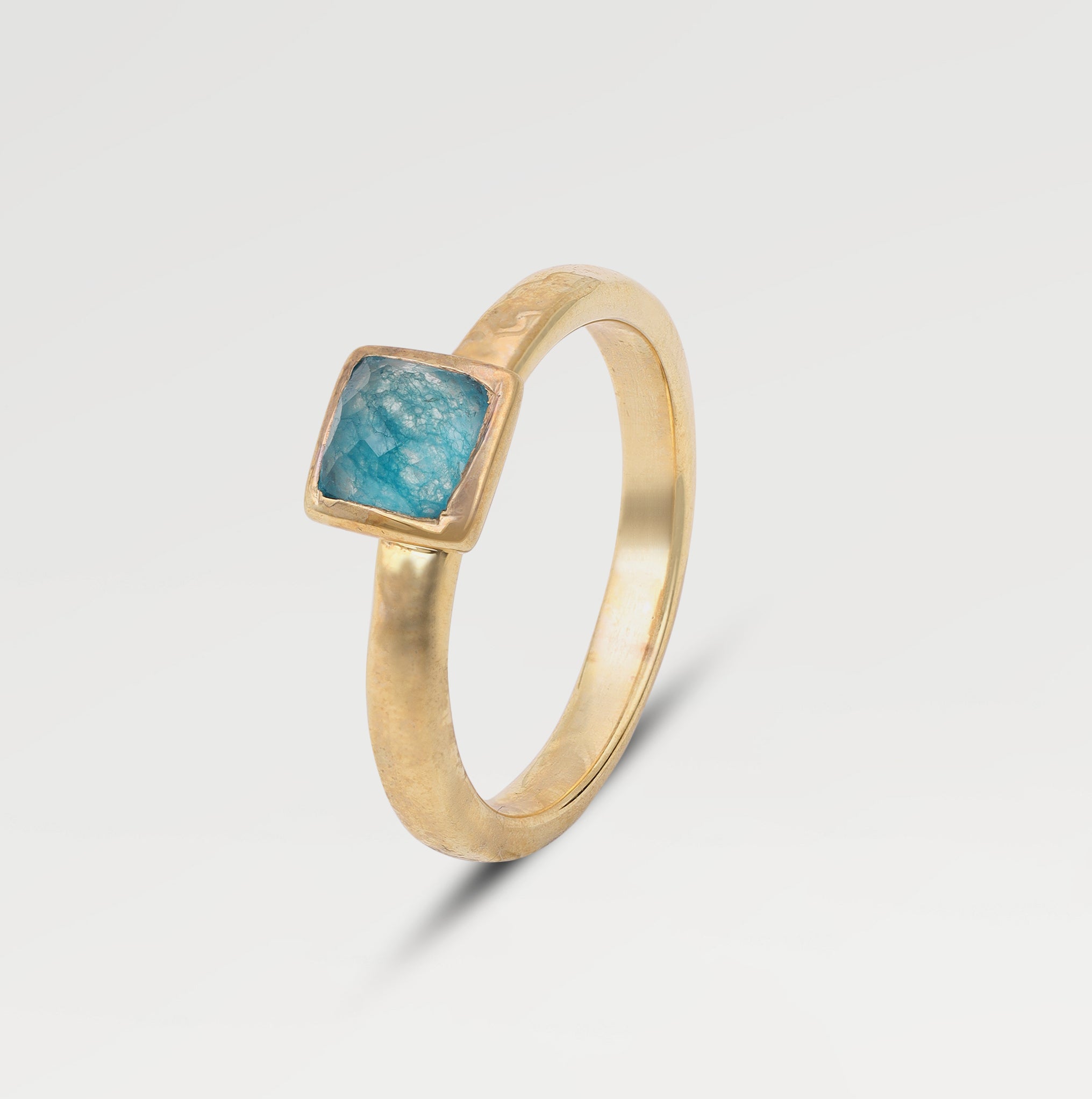 The Grace Yellow Gold Plated Teal Quartz Hammered Ring is crafted from brass with a yellow gold plating, featuring a hammered band and a bezel-set square teal cubic quartz centerpiece. Weighing 2.69 grams, this ring combines textured elegance with vibrant color, delivering a refined accessory suited for both everyday wear and special occasions.