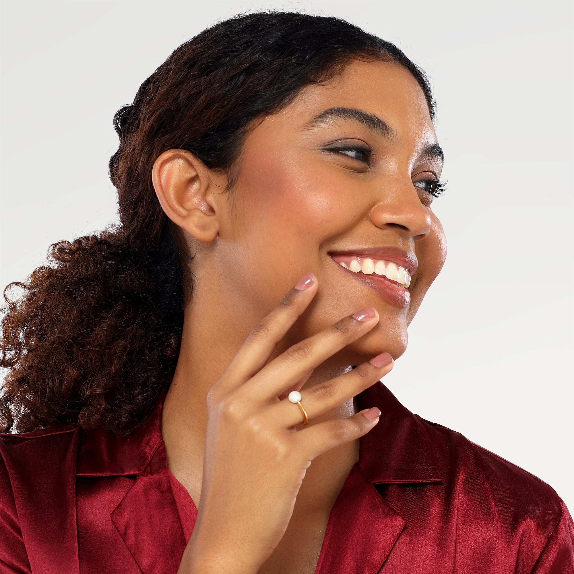 The Nora Yellow Gold Plated Pearl Bead Ring is crafted from brass with a 3-micron yellow gold plating, providing enhanced durability and a rich finish. Featuring a single cabochon round pearl, this ring combines classic elegance with minimalist design. Weighing just 1.75 grams, it offers a lightweight yet sophisticated accessory suitable for everyday wear or special occasions.