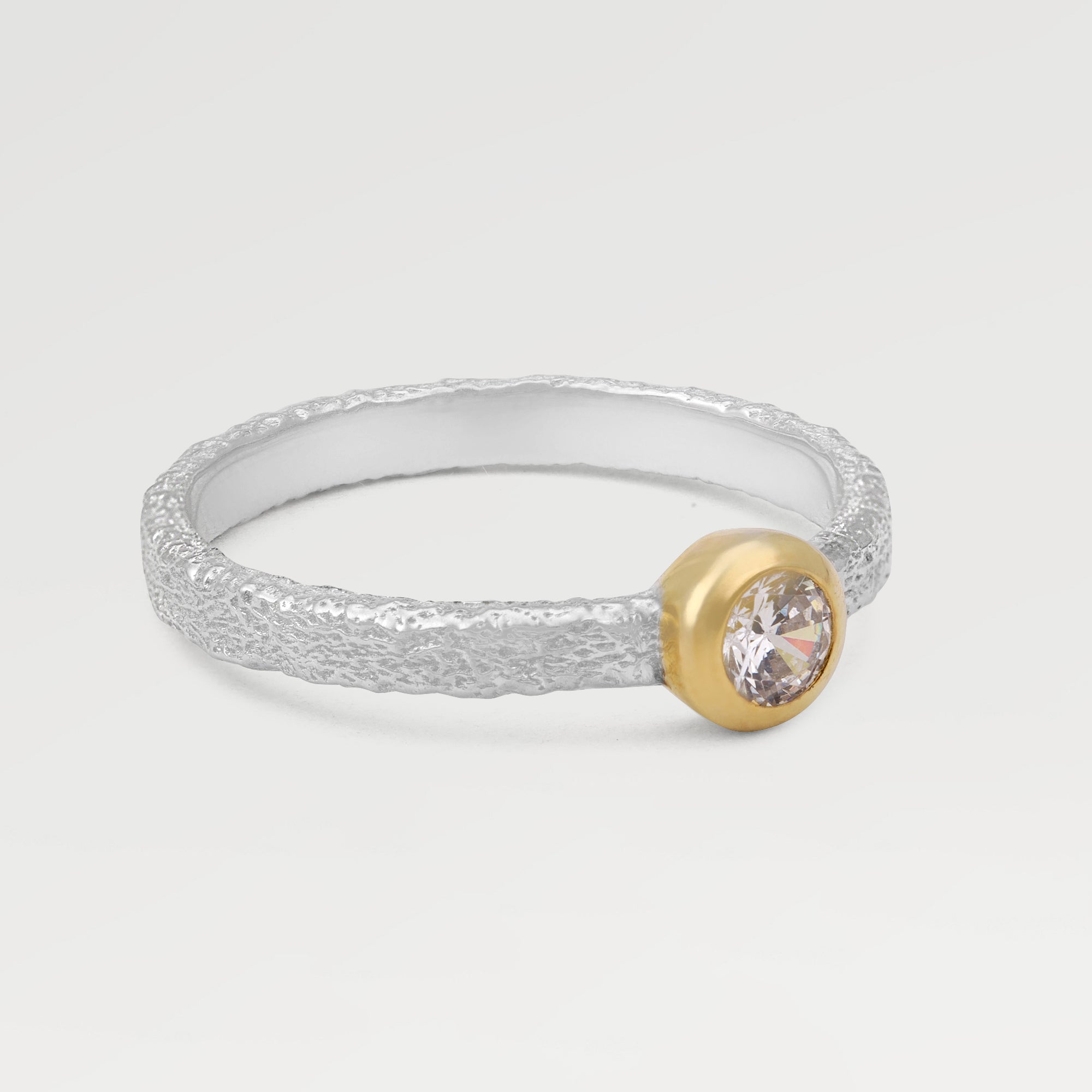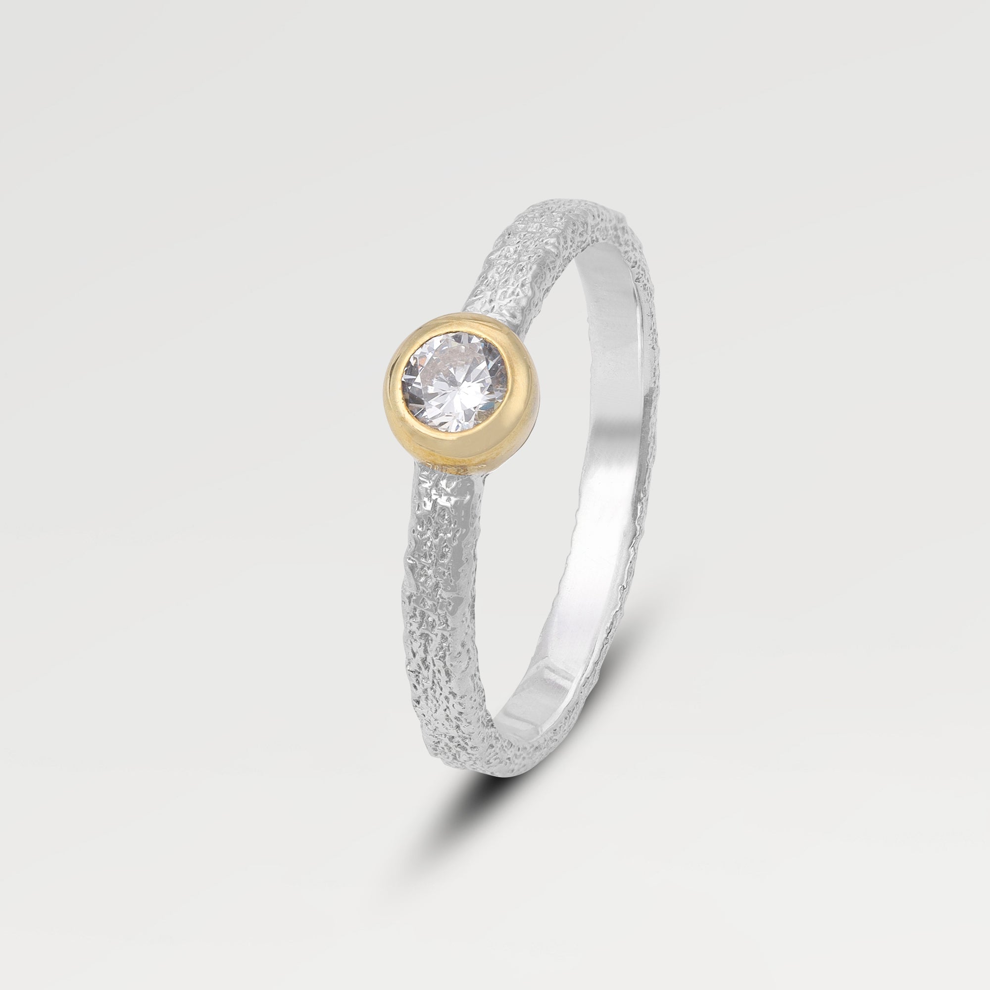 The Kate Two Tone Yellow Gold Zircon Bezel Ring combines expert design with refined materials, featuring a bezel-set round white cubic zirconia framed by a hammered 925 sterling silver collet plated in yellow gold. The high-polish shank enhances its sophisticated two-tone appeal, while the lightweight 2.32 grams ensures comfortable daily wear. This ring offers a perfect balance of elegance and contemporary style.