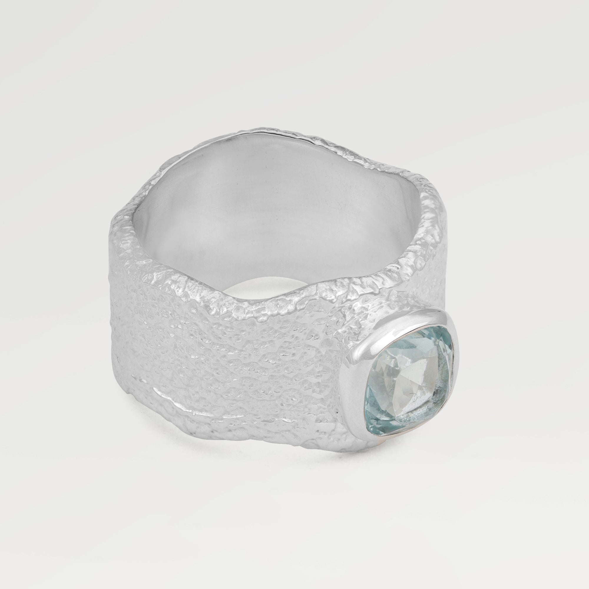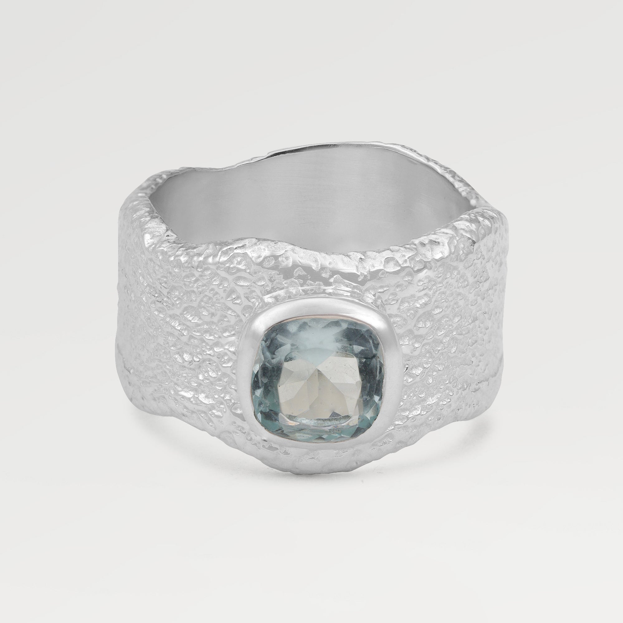 The Ruby Silver Plated Aqua Cushion Bezel Ring features a cushion-cut crystal in a soft aqua shade, expertly set in a textured 925 sterling silver band with silver plating. Weighing 11 grams, this ring combines substantial presence with refined design, making it a standout piece that balances elegance and enduring style.