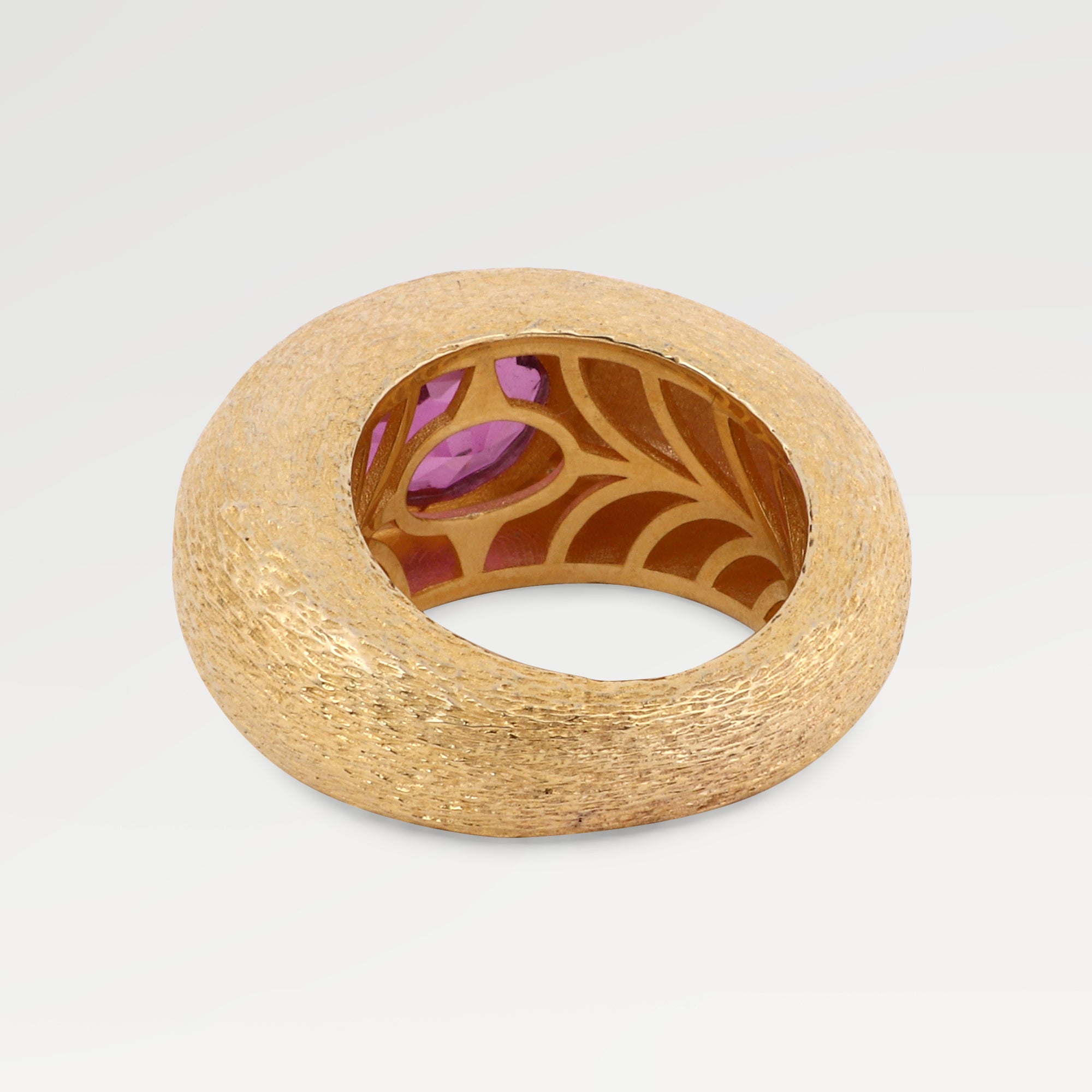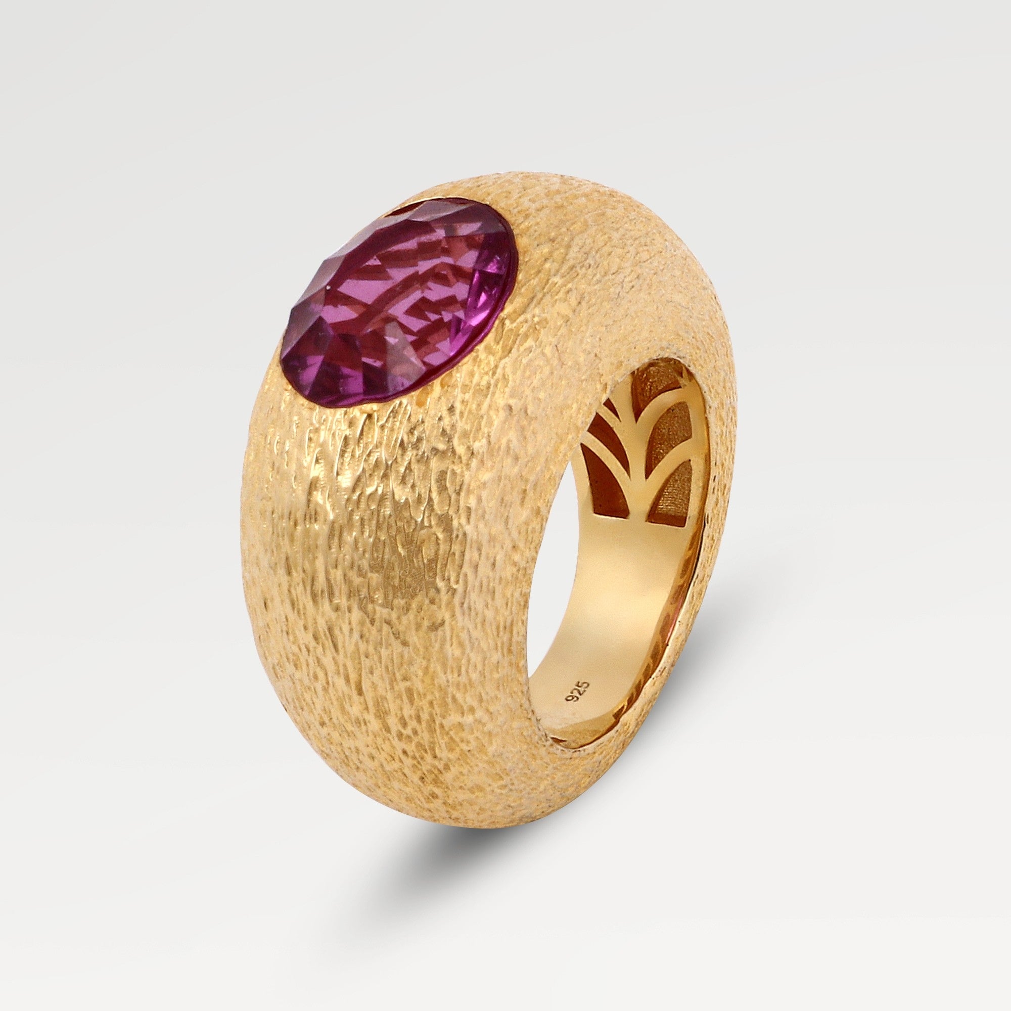 The Zoe Gold Plated Silver Rhodolite Quartz Ring showcases a textured bezel design crafted from 925 sterling silver with gold plating. Featuring a striking concave cut oval doublet rhodolite quartz, this 17.10-gram ring combines expert craftsmanship with a bold, elegant aesthetic. Its unique gemstone cut and refined finish make it a distinguished piece for sophisticated jewelry collections.